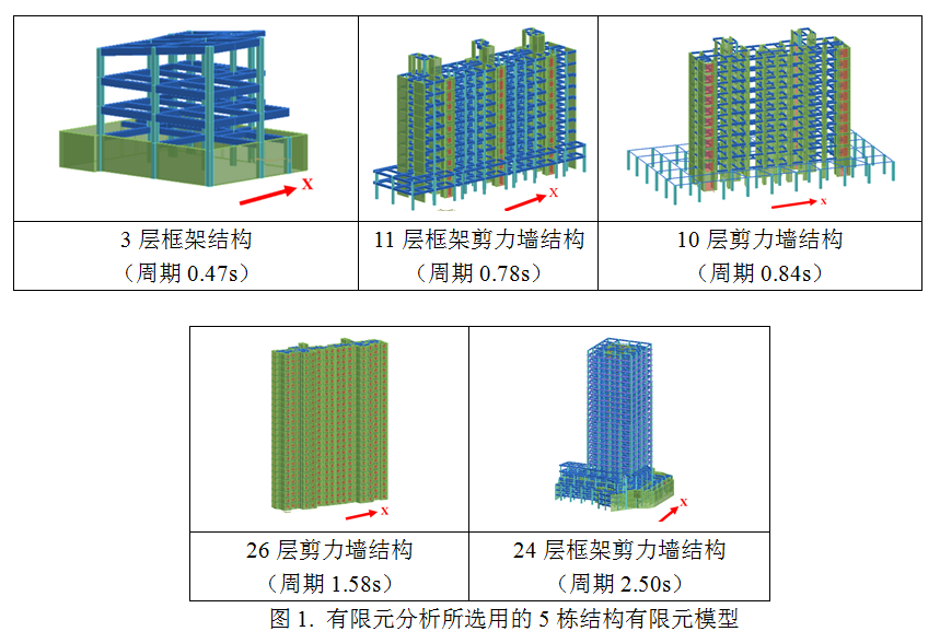 為評估結構在此次地震動的破壞水平,選取了實際記錄到的儀器烈度對應的5組強震記錄,開展了針對當?shù)乜拐鹪O防烈度為8度0.2g的5棟典型鋼筋混凝土結構房屋的非線性動力響應時程分析。5棟結構包括1棟框架、2棟框剪及2棟剪力墻,結構基本周期從小到大分別是0.47s,0.78s,0.84s,1.5s和2.5s。分析主要給出了對結構安全和建筑內人員體感影響明顯的層間相對位移和樓層加速度響應結果。表2為選取的地震動記錄相關信息。圖1為選取的5棟結構的有限元模型示意圖,圖2至圖6為五棟結構的初步分析結果。
