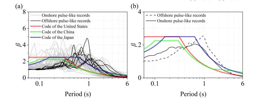 圖3 (a)陸域設計譜、海域和陸域脈沖型地震動記錄的水平向歸一化反應譜; (b) 陸域設計譜的水平向歸一化反應譜與海域和陸域脈沖型地震動記錄的水平向歸一化反應譜的均值