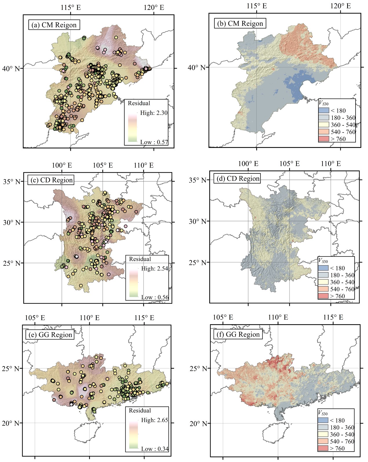 圖4首都圈、川滇及兩廣地區(qū)殘差的空間變化趨勢及更新后的區(qū)域VS30預(yù)測結(jié)果
