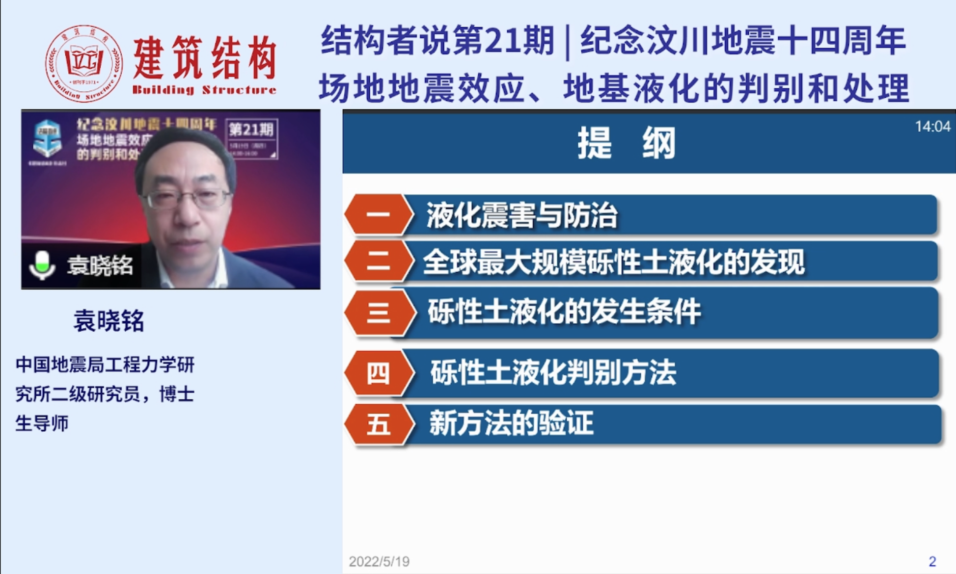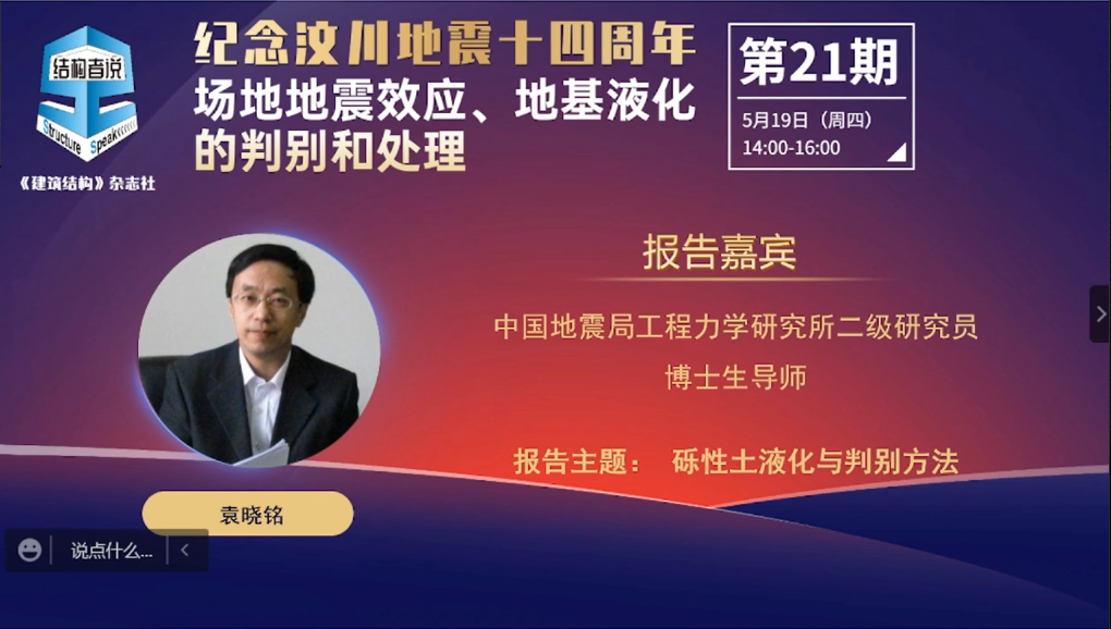 發(fā)布時(shí)間: 2022-05-24 點(diǎn)擊數(shù)量:3635袁曉銘研究員的報(bào)告中,介紹了2008年汶川大地震中發(fā)生的全球最大規(guī)模的礫性土液化及震害現(xiàn)象,解釋了礫性土液化的機(jī)理和觸發(fā)條件;介紹了具有中國特色的礫性土液化判別方法以及通過國際合作對新方法的驗(yàn)證結(jié)果。報(bào)告面向一線工程技術(shù)人員,采用深入淺出的方式進(jìn)行講解,受到工程技術(shù)人員的歡迎。報(bào)告后的互動提問環(huán)節(jié),袁曉銘研究員在線回答了聽眾提出的關(guān)于“學(xué)校和醫(yī)院提高一度進(jìn)行液化設(shè)防的必要性”、“礫性土和砂土液化判別方法的差別”、“不液化和不考慮液化概念的區(qū)別”等一系列問題。