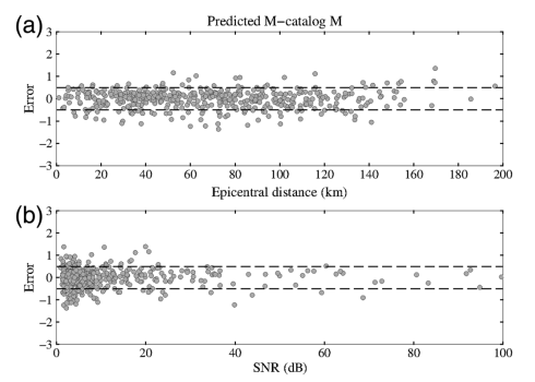 圖2 P波到達后3秒,基于TLSVM-M模型的單臺震級估計誤差與(a)震中距和(b)信噪比的關(guān)系
