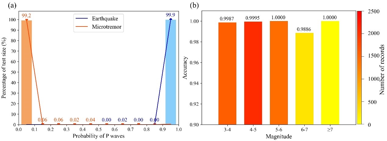 (a)測試數據百分比與P波輸出概率的關系 (b)模型分類準確率與震級的關系